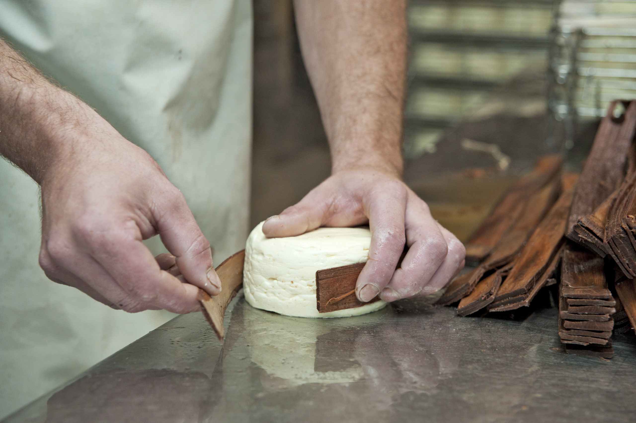 Les Mont d’Or sont démoulés et immédiatement sanglés manuellement d’une sangle en épicéa.